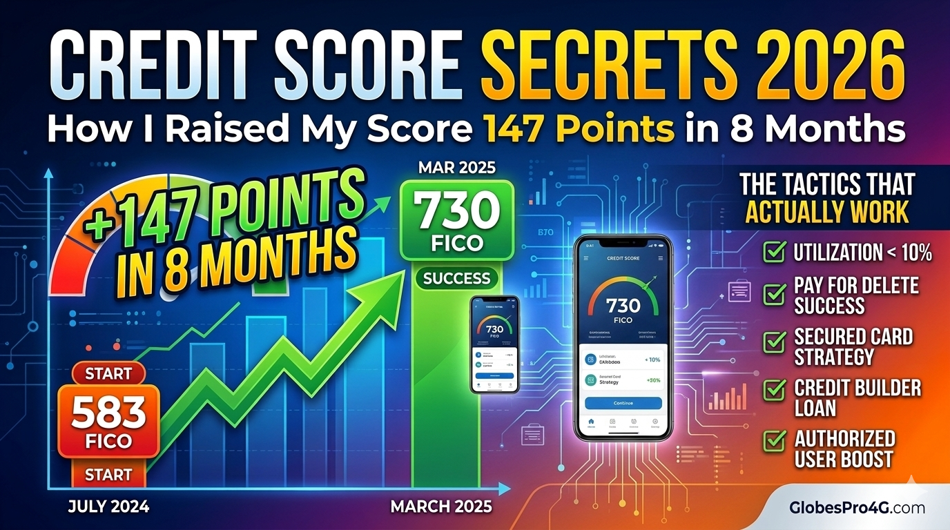 Results Disclaimer: Credit score improvements of 147 points in 8 months represent personal results from GlobesPro4G.com testing. Your results will vary based on your starting credit profile, negative items, utilization, and other factors. Some individuals may see faster improvement; others may see slower progress. There are no guaranteed outcomes in credit building.